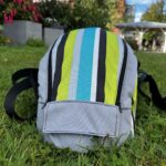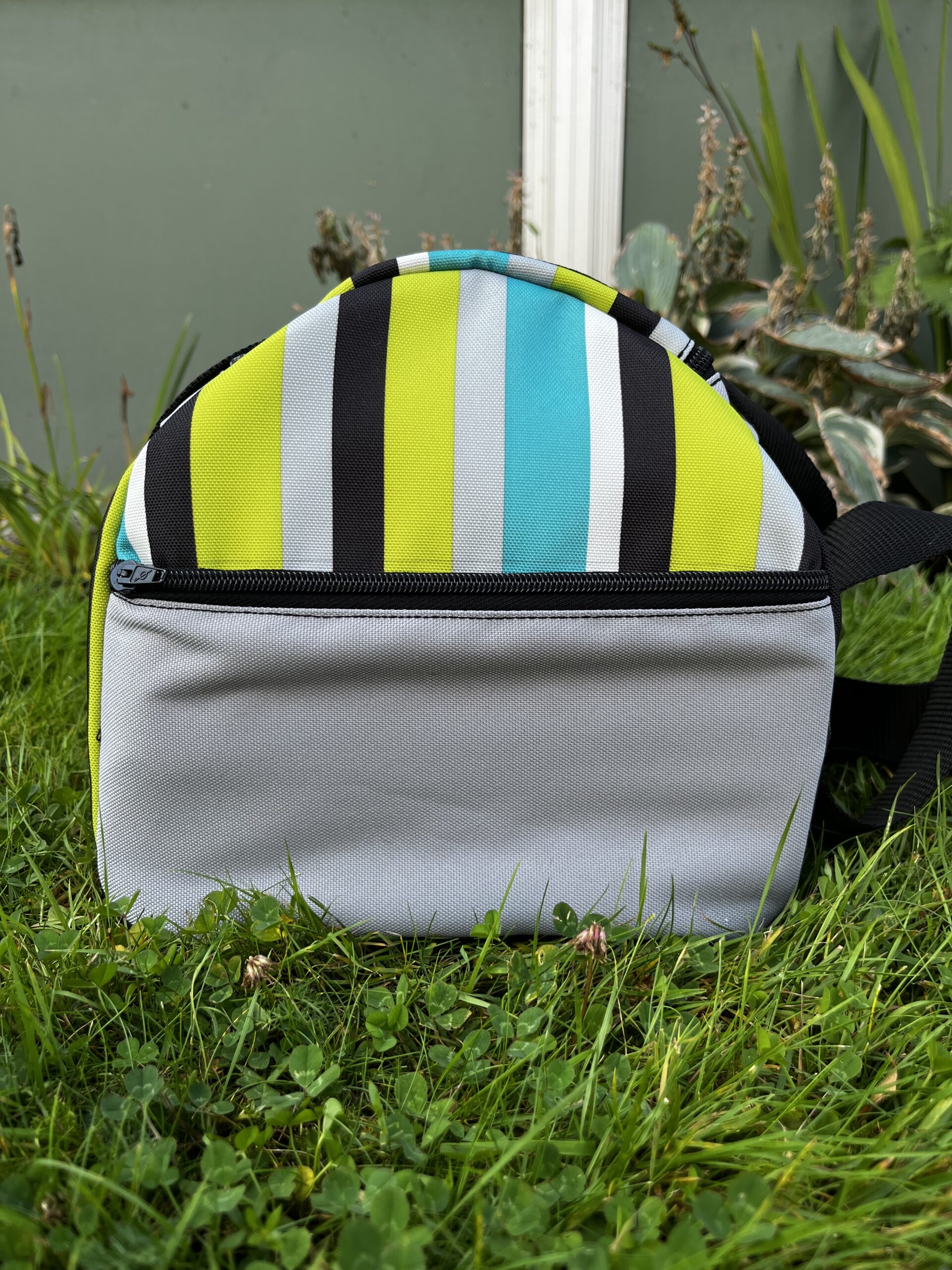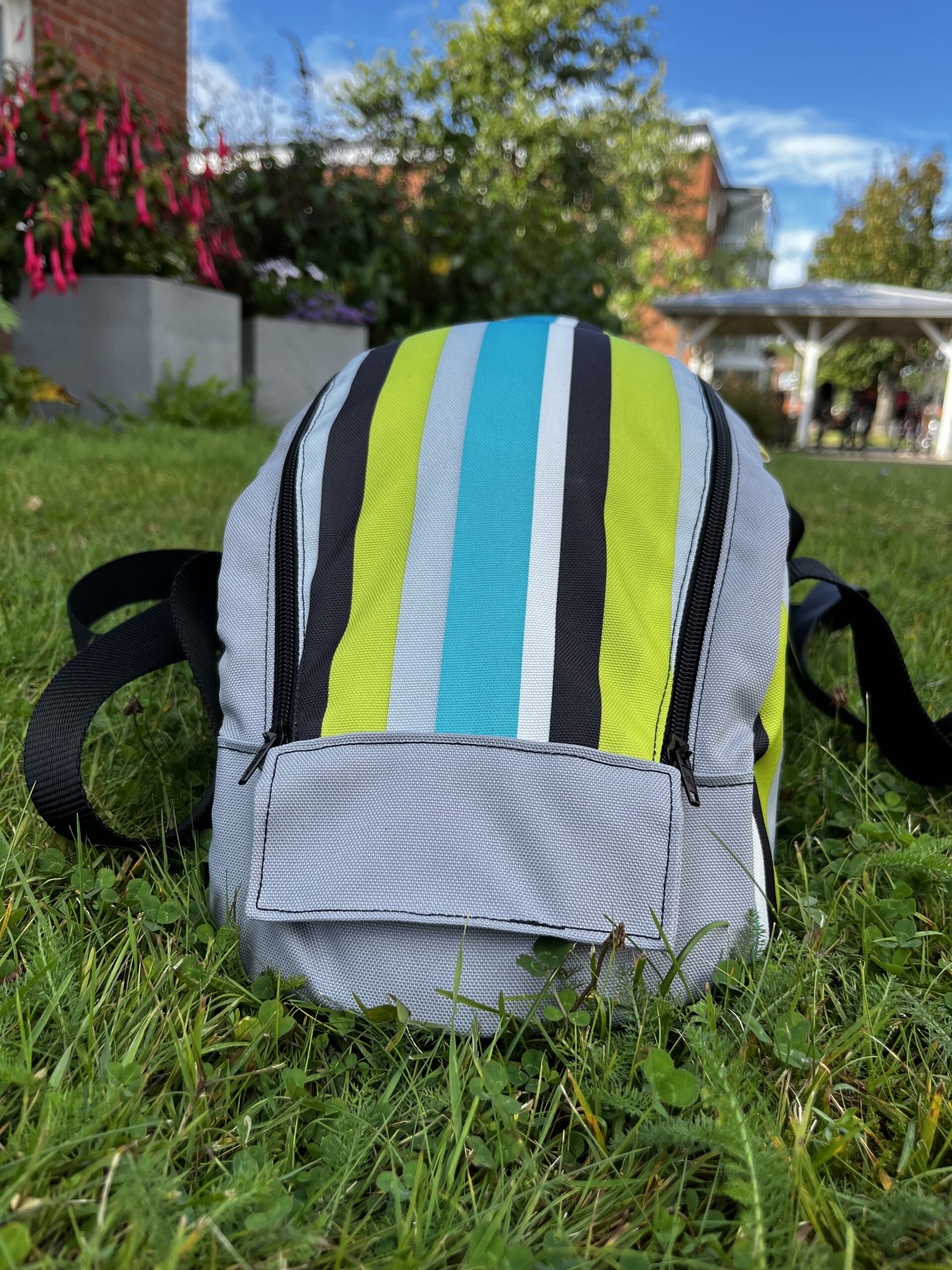 Tyg 2: Ficka baksida, sidor vid lock och de delar med kardborre vid öppningen (grått tyg på ”Green stripes”)